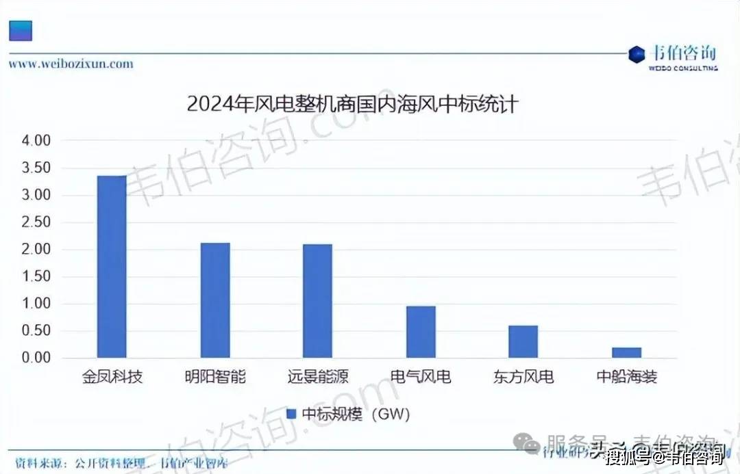 海优势机:2024年,邦内海风风机招标中金风科技、明阳智能、前景能源中标范畴处于行业前三,金风科技往年市占率较低但2024年中标范畴升至行业第一。